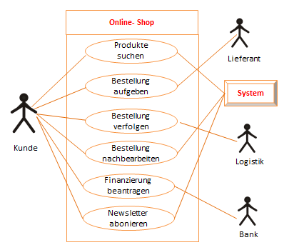 Die daneben stehende Grafik zeigt in einer Übersicht beispielhaft, wie Use Cases miteinander verknüpft sein können. Im Praxisbeispiel Online- Shop wurde für jede Persona ein Dokument mit den möglichen Use Cases angelegt.